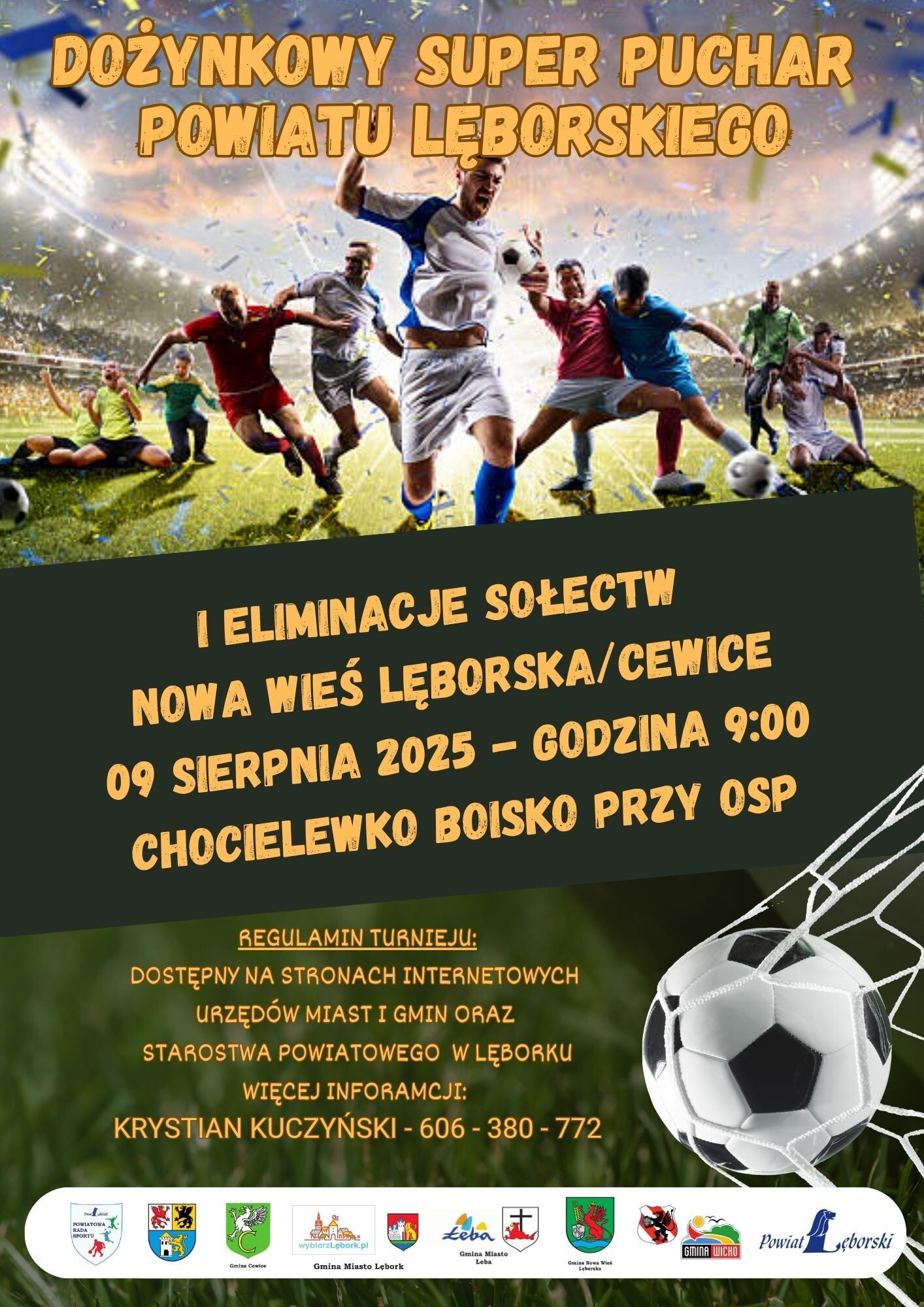 Starosta Lęborski Tomasz Litwin, Wójt Gminy Nowa Wieś Lęborska Szymon Medalion oraz Wójt Gminy Cewice Jerzy Bańka zapraszają do zapisów na I Eliminacyjny Dożynkowy Turniej o Super Puchar Powiatu Lęborskiego dla sołectw Nowej Wsi Lęborskiej oraz Cewic.