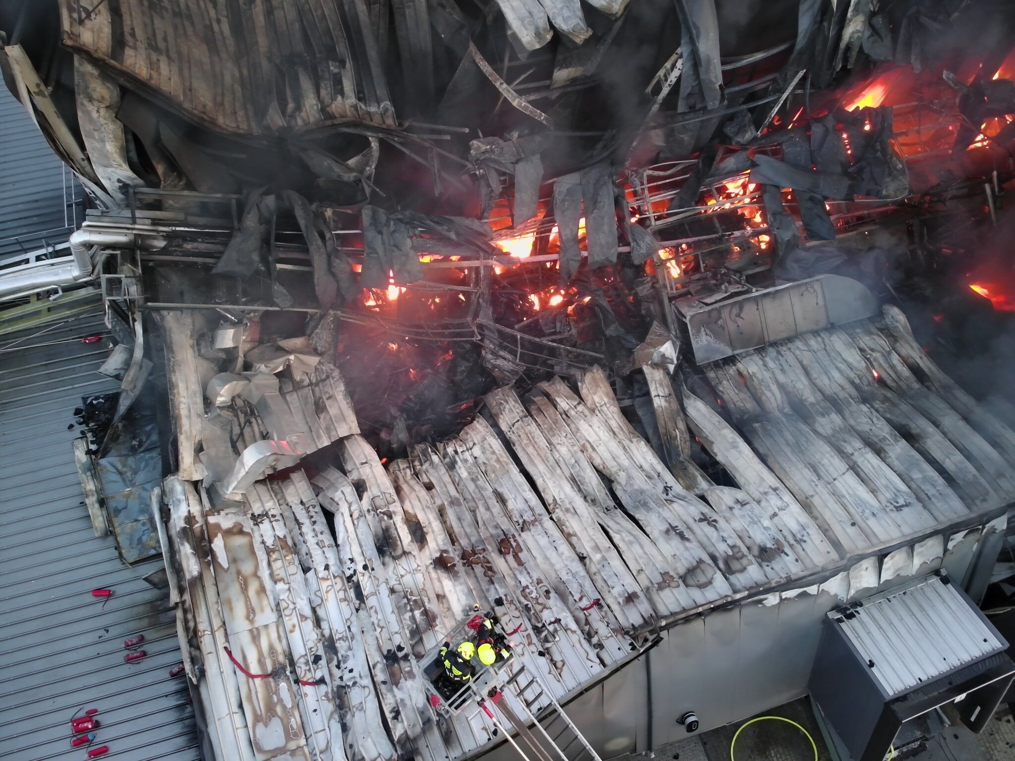 W dalszym ciągu trwają poszukiwania jednego strażaka ochotnika, który w początkowej fazie akcji spadł z 8 metrów do hali i nie został odnaleziony.
