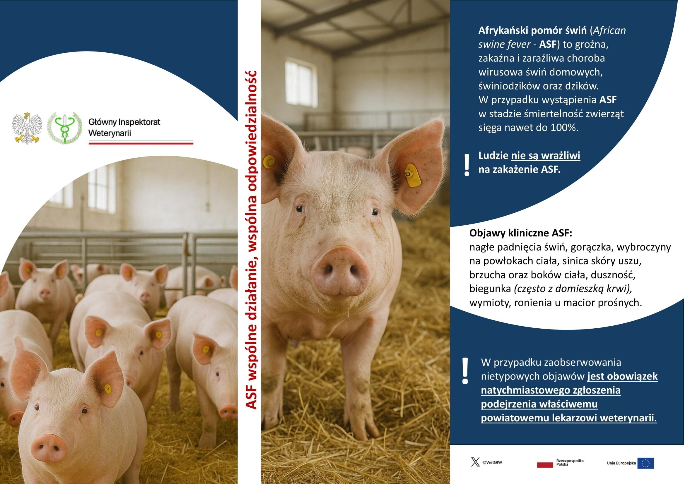 W związku z coraz większym natężeniem prac polowych Powiatowy Lekarz Weterynarii w Lęborku apeluje do wszystkich Hodowców świń o zachowanie reżimu bioasekuracji na terenie Państwa gospodarstw. Afrykański pomór świń to śmiertelna, zakaźna oraz zaraźliwa choroba świń oraz dzików. Nie zagraża życiu i zdrowiu człowieka. Powoduje jednak znaczne straty dla właścicieli świń oraz dla producentów mięsa wieprzowego. U zwierząt występuję gorączka, może osiągać nawet do 42°C, przyśpieszony oddech, osowiałość, możliwa utrata apetytu i pragnienia (niekoniecznie), przekrwienia lub zasinienia mogą wystąpić na uszach, ogonie, kończynach i klatce piersiowej. Zazwyczaj pierwsze w stadzie chorują duże sztuki: lochy, knury, tuczniki. Padnięcia nawet pojedynczych świń w stadzie mogą być skutkiem rozwijania się zakażenia świń wirusem ASF w gospodarstwie. Nie należy zatem zwlekać ze zgłoszeniem informacji o niepokojących objawach do lekarza weterynarii opiekującego się stadem lub do najbliższej lecznicy dla zwierząt. W przypadku wykrycia ASF w gospodarstwie, w którym przestrzegane są przepisy prawa dotyczące zdrowia zwierząt oraz identyfikacji i rejestracji świń – właścicielowi przysługuje pełne odszkodowanie za zabite zwierzęta, zniszczone produkty i sprzęt w gospodarstwie.